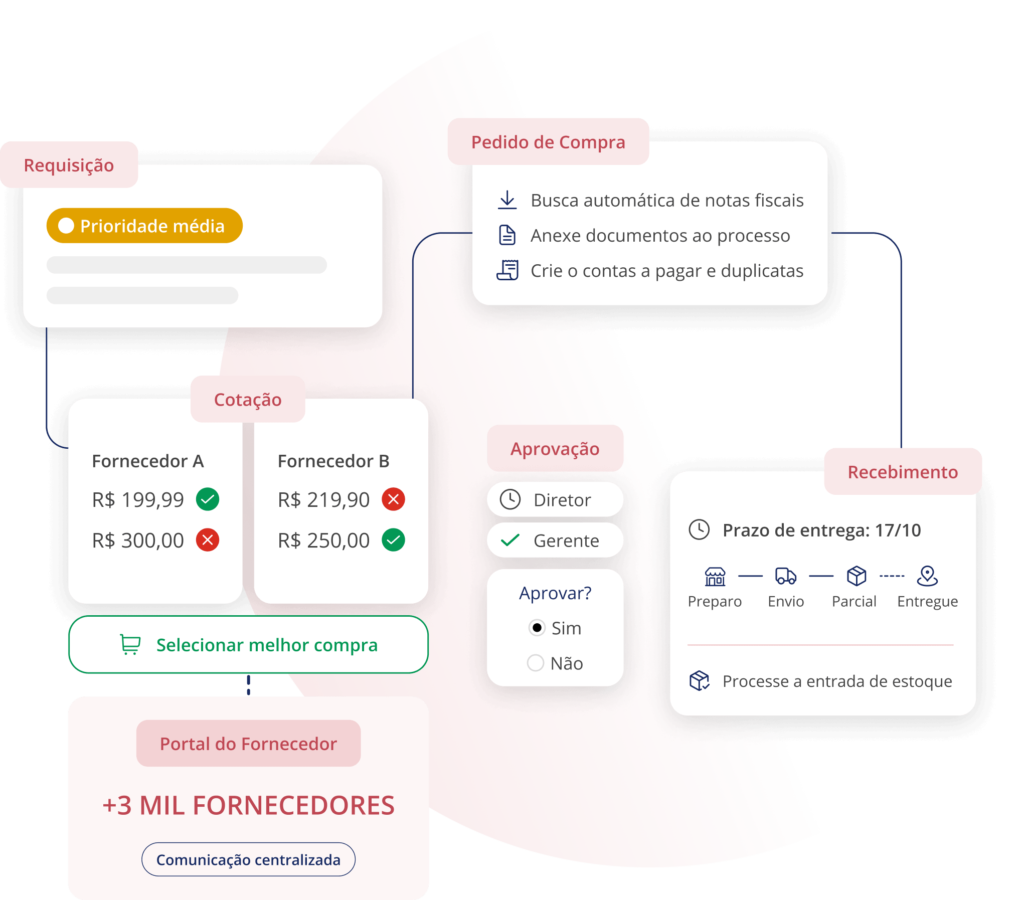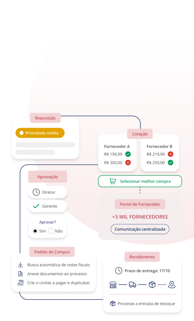 Oferecemos um fluxo completo, centralizado e customizado, eliminando a necessidade de múltiplas ferramentas. Acompanhe suas compras do inicio ao fim, se comunique com seus fornecedores de forma simples e esteja sempre atualizado sobre o andamento das suas compras.
