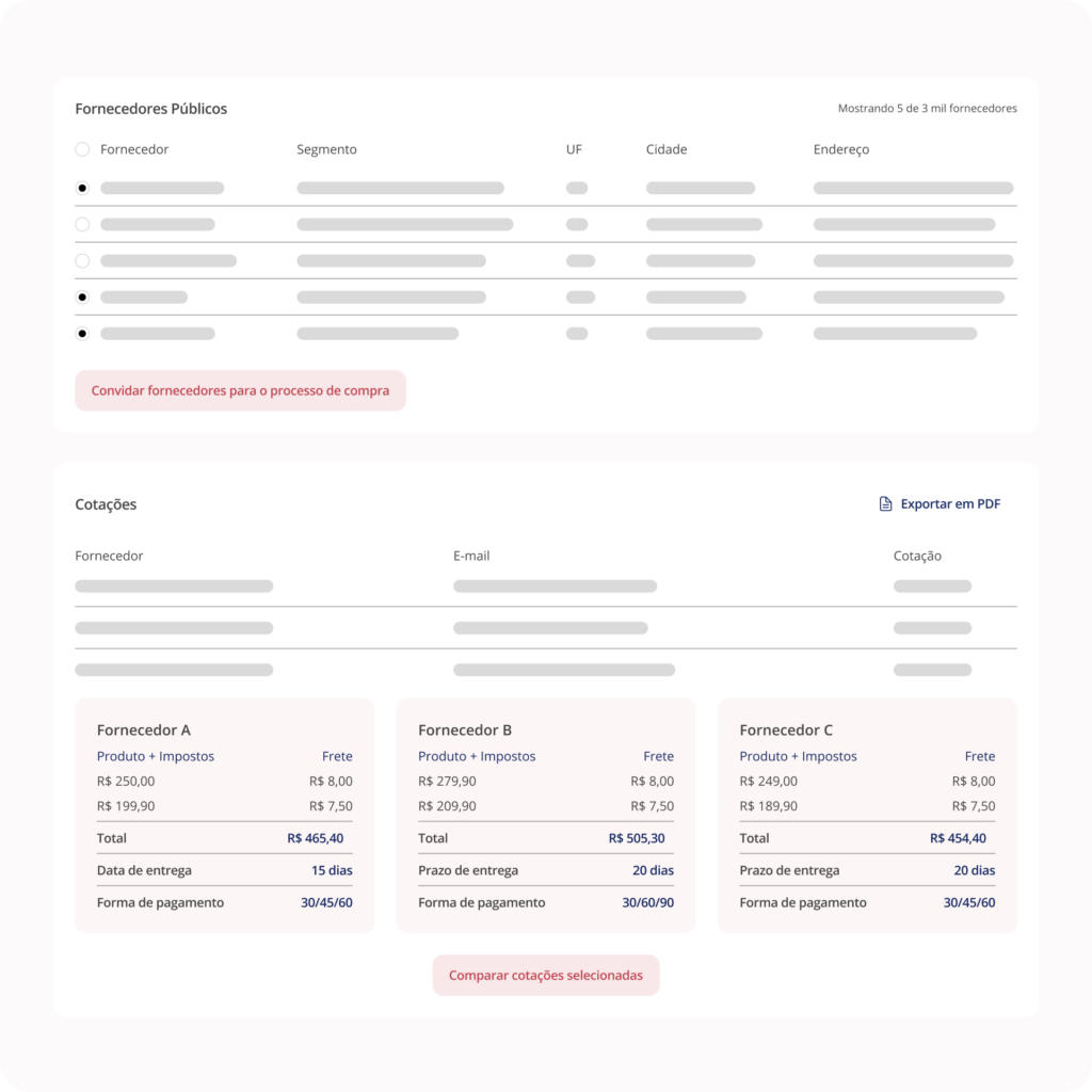 Além disso, compartilhe seus processos de compra com uma base de mais de 3.000 fornecedores cadastrados, ampliando suas oportunidades de negociação e garantindo as melhores condições para sua empresa.